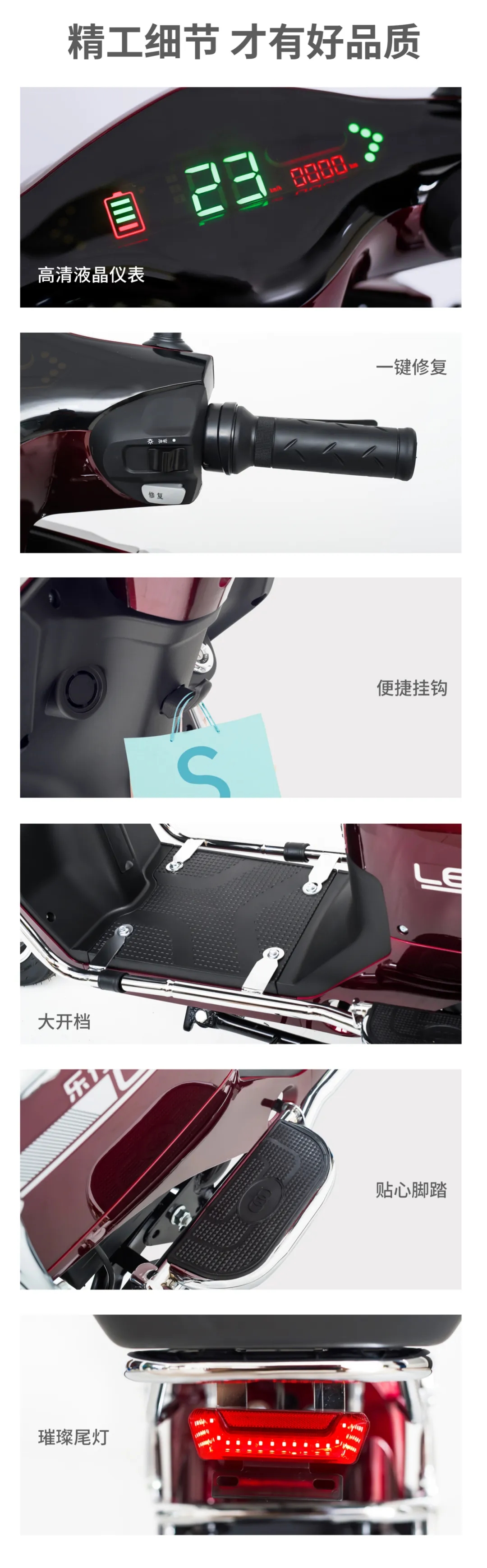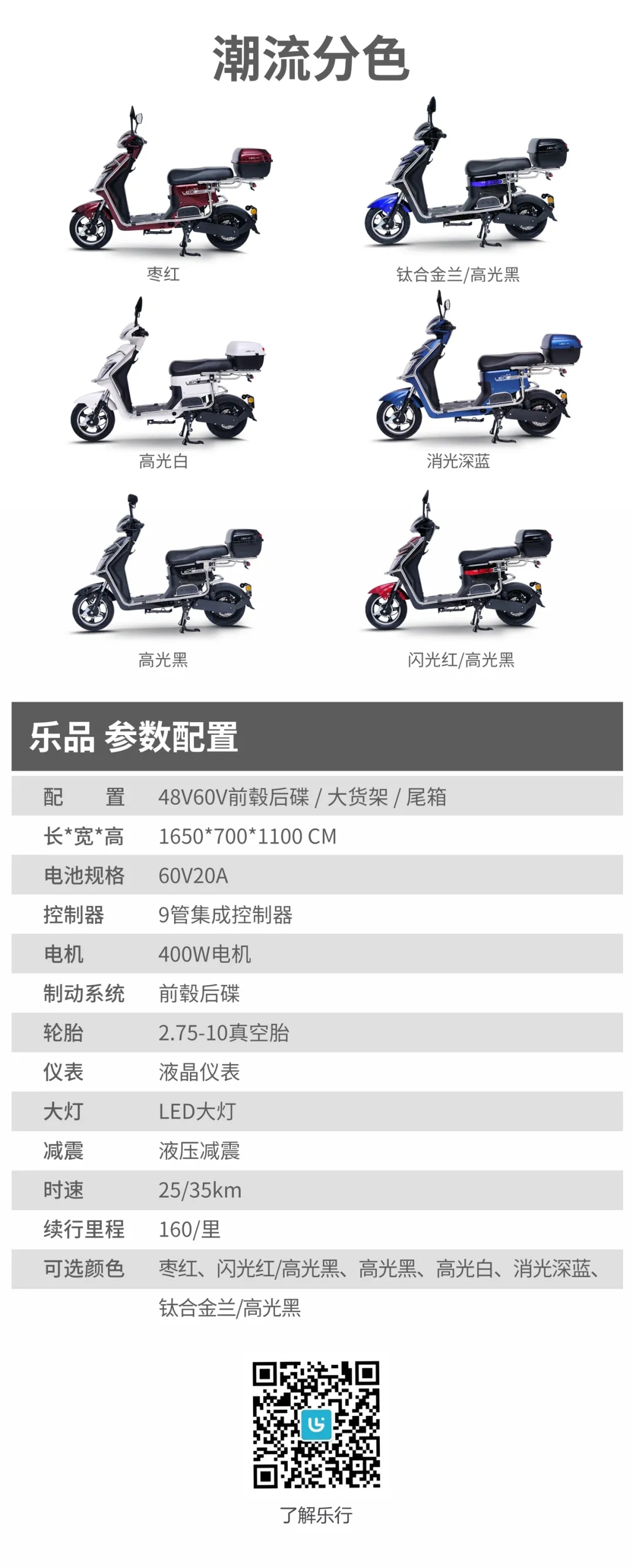 乐行电车家族新成员——乐品 采用ABS加厚塑件和日本卡秀烤漆 耐用且韧性高,可保外观3年依旧光亮如新 车身符合国标设计,精致又不失动力。